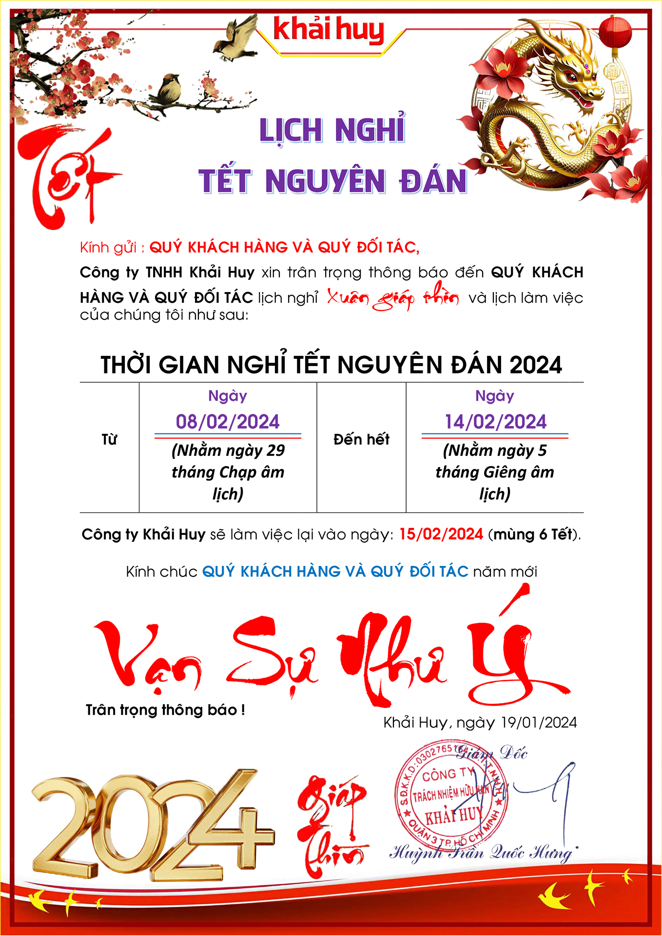 THÔNG BÁO LỊCH NGHỈ TẾT NGUYÊN ĐÁN 2024