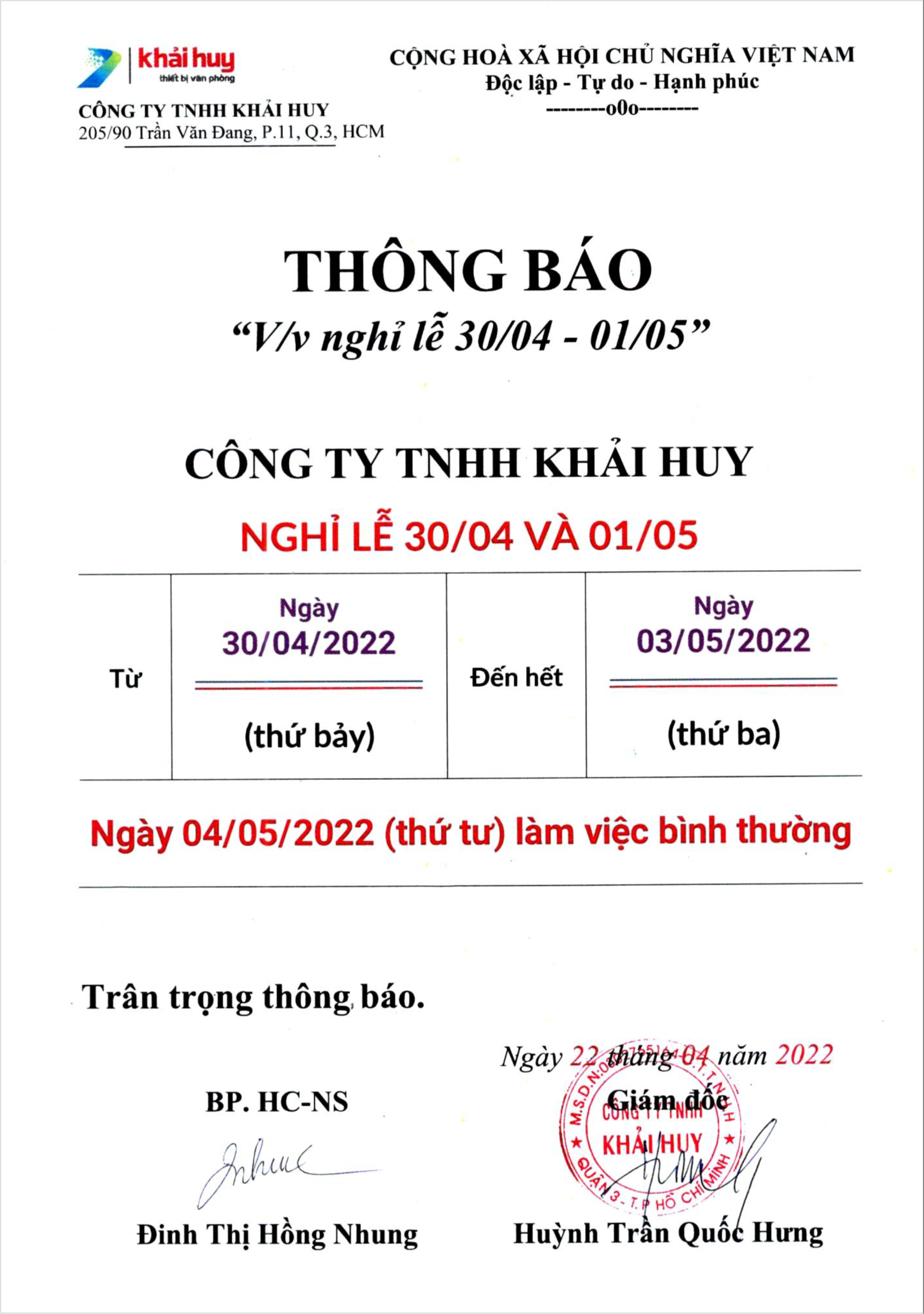 THÔNG BÁO NGHỈ LỄ 30/04 -01/05